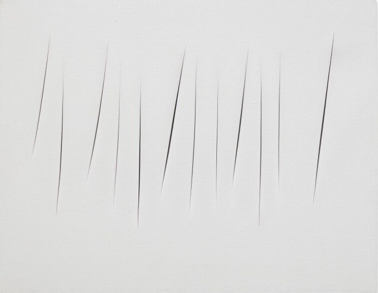 Lucio Fontana’s art work called THE WHITE SLASH is little more than a blank canvass with several Stanley knife slashes through it. Fontana is regarded as the founder of Spatialism. The artwork below is in the Tagli style as opposed to his Bucchi style in which he punctures holes in the canvass instead of slashes.